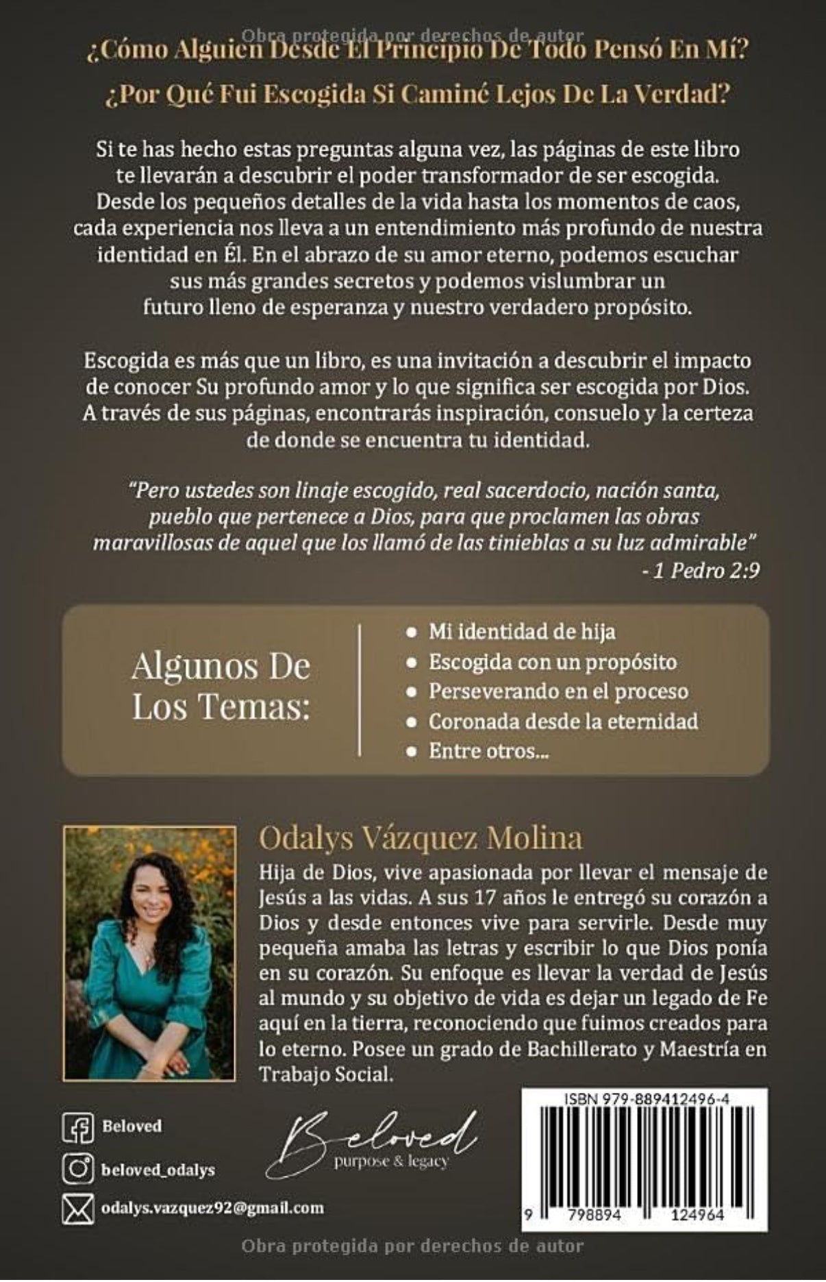 Si te has hecho estas preguntas alguna vez, las páginas de este libro te llevarán a descubrir el poder transformador de ser escogida. Desde los pequeños detalles de la vida hasta los momentos de caos, cada experiencia nos lleva a un entendimiento más profundo de nuestra identidad en Él. En el abrazo de su amor eterno, podemos escuchar sus más grandes secretos y podemos vislumbrar un futuro lleno de esperanza y nuestro verdadero propósito. Escogida es más que un libro, es una invitación a descubrir el impacto de conocer Su profundo amor y lo que significa ser escogida por Dios. A través de sus páginas, encontrarás inspiración, consuelo y la certeza de donde se encuentra tu identidad.